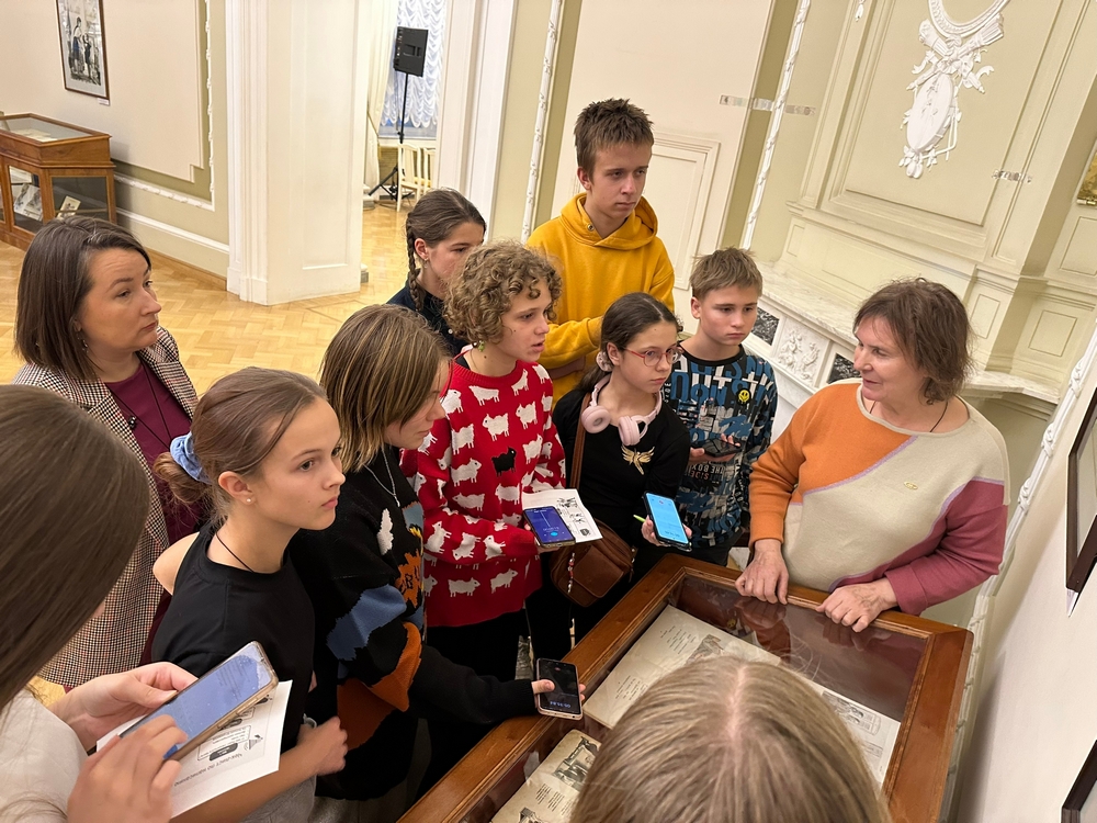 Екатерина Павловна Загорская, ведущий библиограф Библиотеки Дворца, рассказала ребятам об экспозиции, интересных фактах из жизни художника и о процессе подготовки выставки, а затем ответила на множество вопросов юных корреспондентов.