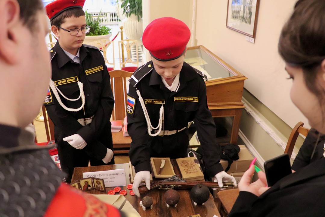 Перед началом основной части гости смогли познакомиться с передвижной выставкой экспонатов школьных музеев. Учащиеся школ, активисты школьных музеев сами проводили экскурсии по мини-выставкам: демонстрировали личные вещи Зои и Александра Космодемьянских, музыкальные инструменты довоенного и военного времени, рассказывали о героях своих школ и регионах. Кадеты из Кронштадта привезли ремень, флотскую бляху и подсумок для патронов и личные вещи мальчика 15-лет, найденные поисковым отрядом в 2020-м году на Невском пятачке.