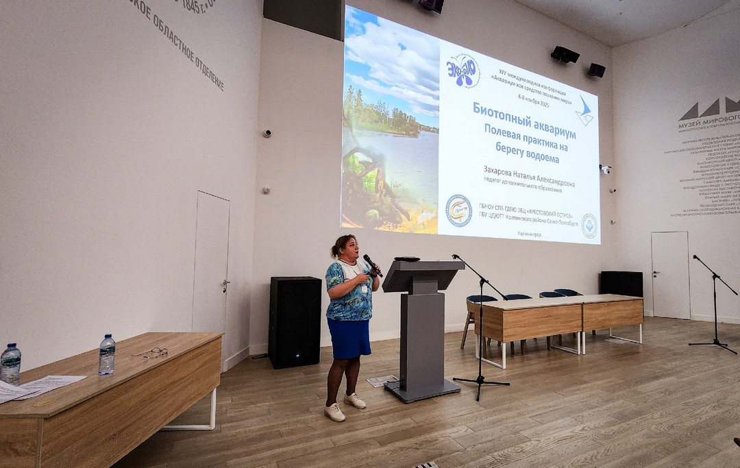 На конференции педагоги Светлана Викторовна Кириллова, Наталья Александровна Захарова и Олег Дмитриевич Филиппов делились опытом и рассказывали коллегам о профориентации для школьников в структуре обучения аквариумистики, а также о форматах полевых практик на берегу водоема и создании биотопных аквариумов.