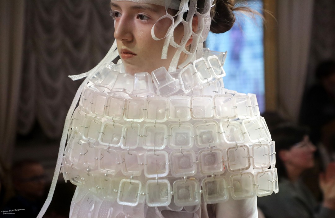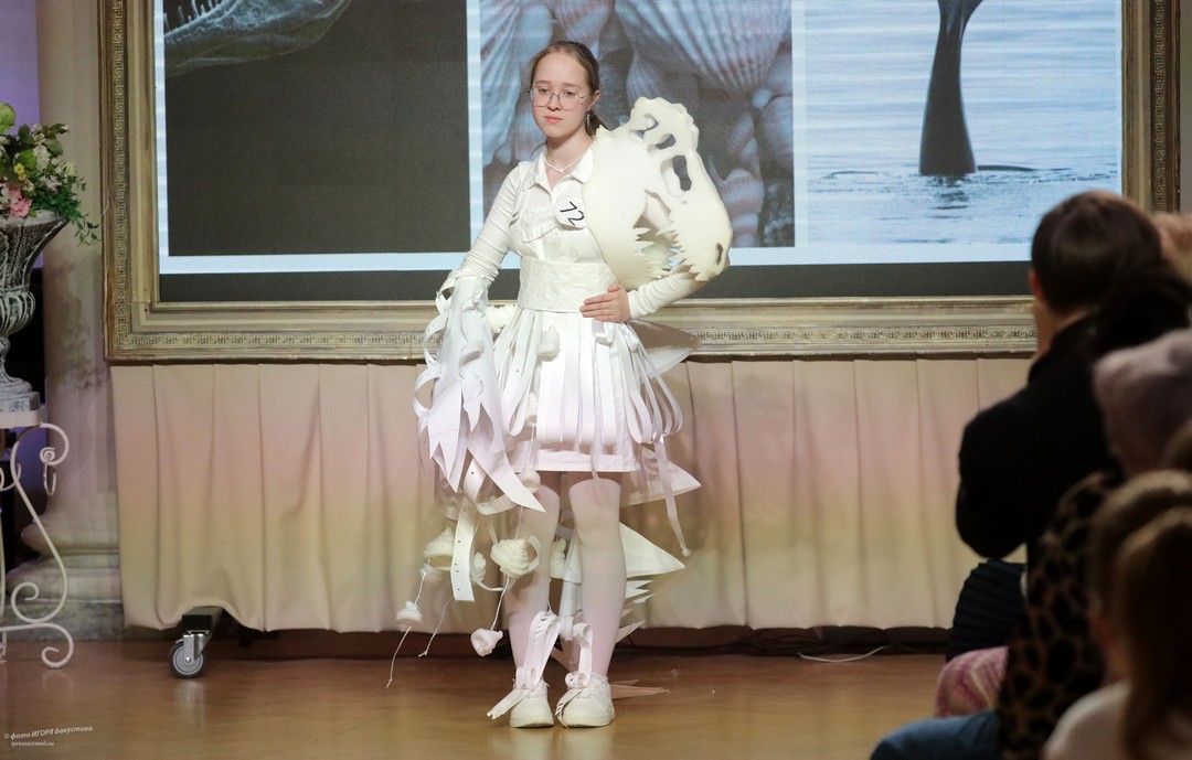 Невероятный полет фантазии увидели члены жюри и зрители. По условия конкурса работы должны быть выполнены с использованием нетрадиционных для создания одежды материалов, различных фактур и только белого цвета. Участники ответственно подошли к созданию своих моделей: использовали пленку в качестве юбки, строительные жгуты как кости древних животных, из бумаги делали голову динозавров и многое другое!